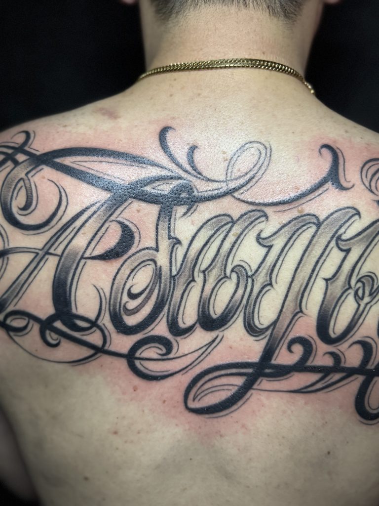 背中 チカーノレター 英語 タトゥー |岡山 倉敷 タトゥー